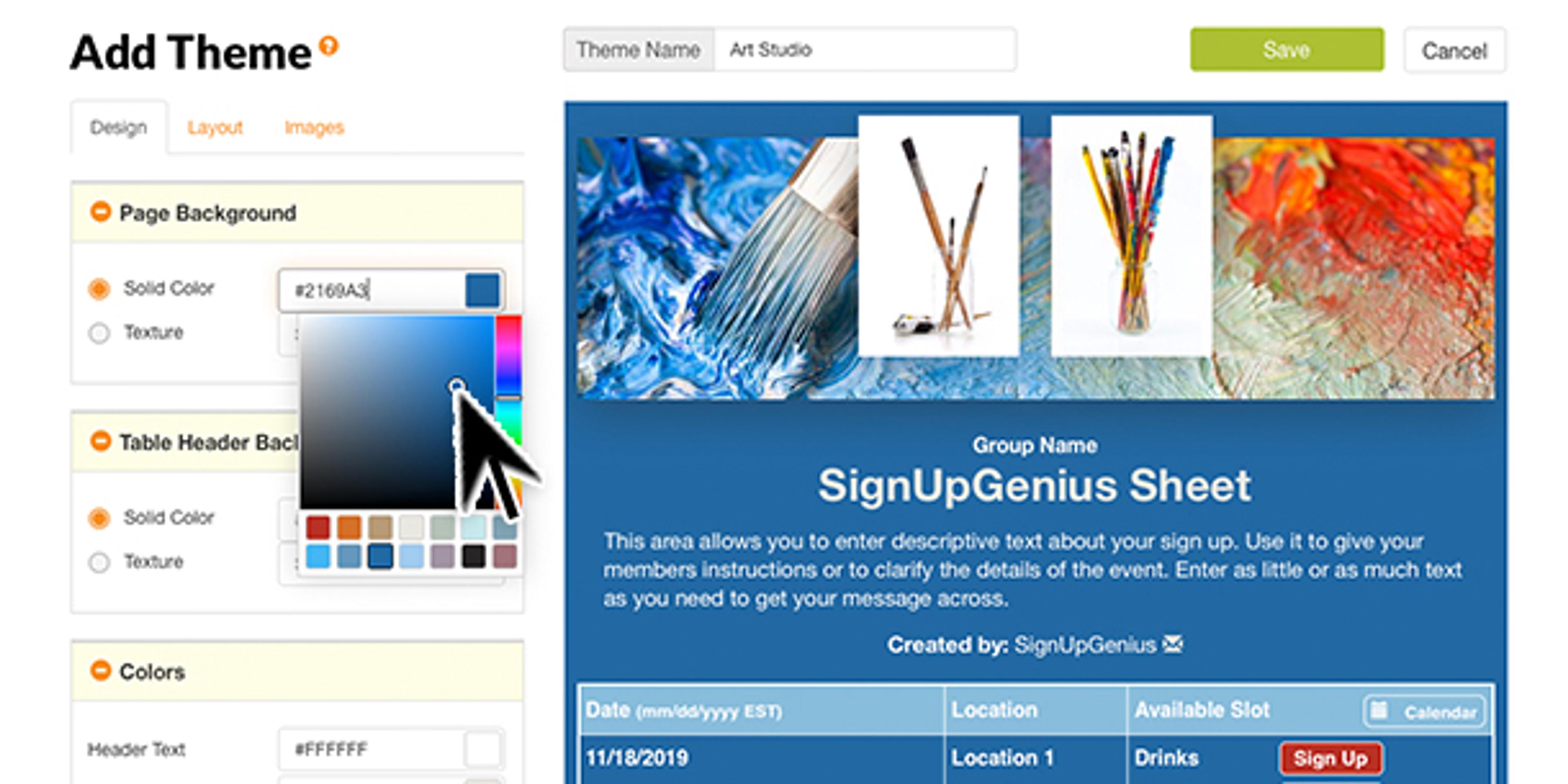 Dreaming of designing your own sign up? You can! With SignUpGenius' easy-to-use Custom Theme Builder tool, Gold and Platinum organizers everywhere can get their Picasso on by creating unlimited custom themes.