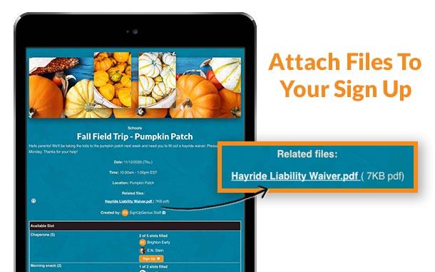 Ever wish you could drop a file onto your sign up? You can! Give your participants all the information they need by attaching that important document, PDF or spreadsheet.